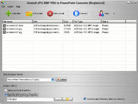 Aostsoft JPG BMP PNG to PowerPoint Converter can help you convert your JPG, JPEG, BMP, PNG Image to PowerPoint presentation (PPT, PPTX, PPTM) and PowerPoint Show( PPS, PPSX, PPSM) in batches easily by only a few simple clicks. It can preserve original layout, text, images, vector drawings of your Image file. More, the processing speed is very fast.